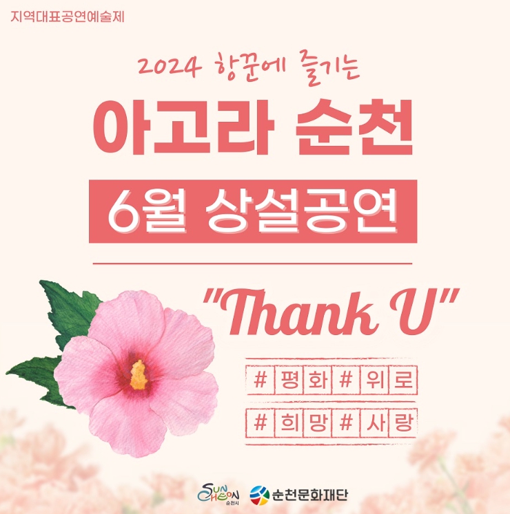 ‘2024 아고라 순천’ 6월 공연은 호국 보훈의 달을 기념하여 의미를 되새기고 평화를 기리는 공연을 진행한다. 이번 공연의 주제는 'Thank U'이며, 대중음악, 다원예술, 무용·댄스, 양악, 국악 등 총 5개 장르의 공연팀들이 순천시 곳곳에서 다양한 공연을 선보일 예정이다.