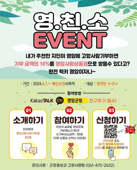 ‘영암 고향사랑기부제를 친구에게 소개해 주세요’의 줄임말 ‘영·친·소’로 명명된 이번 이벤트는, 내가 추천한 지인이 영암에 고향사랑기부하면, 기부 금액의 10%를 나에게 영암사랑상품권으로 영암군이 지급해주는 내용.