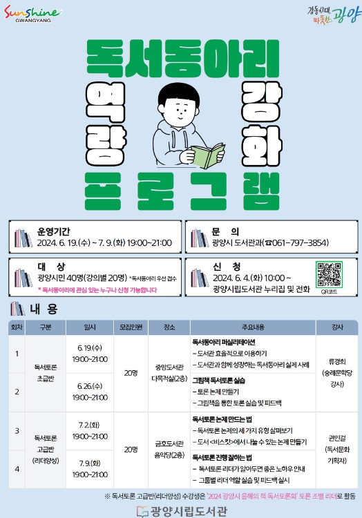 ![]() 광양시립도서관, 독서동아리 역량 강화교육 수강생 모집 |