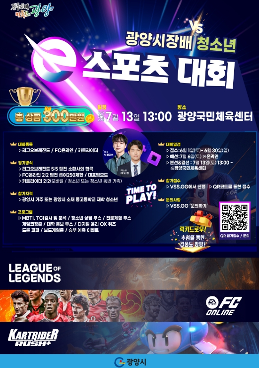 경기는 ▲리그오브레전드 ▲FC 온라인 ▲카트라이더 등 3종목이며, 광양시에 거주하거나 광양시 소재의 중‧고등학교에 재학 중인 청소년이면 참가할 수 있다. 다만, 3종목 중 카트라이더의 경우 청소년 동반 가족에서 2인이 한 팀이 되어 참여 가능하다.