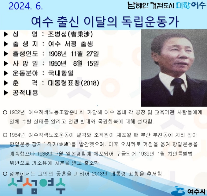 ‘조병섭(曺秉涉)선생’은 1932년 여수적색노동조합준비회에 가담해 여수 읍내 각 공장 공공단체 교육기관 사람들에게 일제 수탈 실태를 알리고 전쟁 반대와 국권 회복을 설파했다.