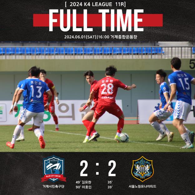 오늘 경기를 관람한 한 홈 팬은 “분위기가 짜릿했고 관중 속에서도 거제시민축구단 선수들의 에너지와 열정이 느껴졌다”며 “이호인의 동점 골은 한동안 잊지 못하겠다”고 설렘을 전해왔다.
