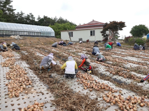 ![]() 6월 1일 현경면 양파 농가에서 봉사활동을 진행한 백련회 |