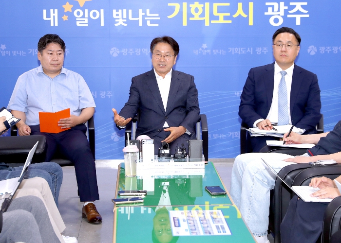 ![]() 강기정 광주광역시장이 3일 오전 시청 5층 기자실에서 출입기자들과 차담회를 갖고 시정 주요현안 등에 대해 설명하고 있다./ 광주광역시 제공 |