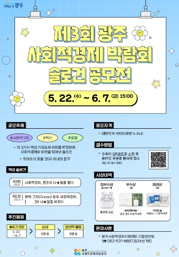 공모전은 사회적경제에 관심있는 대한민국 국민 누구나 참여할 수 있다. 7일 오후 3시까지 구글 폼 주소와 포스터에 기재된 정보무늬(QR코드)를 통해 구호(슬로건)를 작성한 뒤 제출하면 된다.
