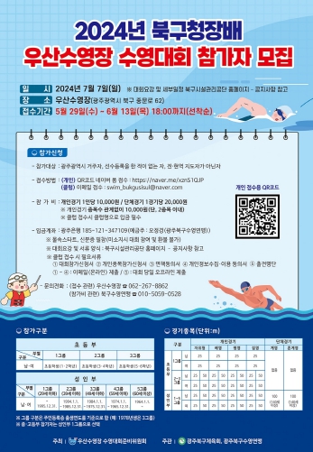‘2024년 북구청장배 우산수영장 수영대회’는 우산수영장 수영대회 준비위원회가 주최하고, 광주북구체육회와 북구수영연맹이 공동으로 주관하여 펼쳐질 예정이다.