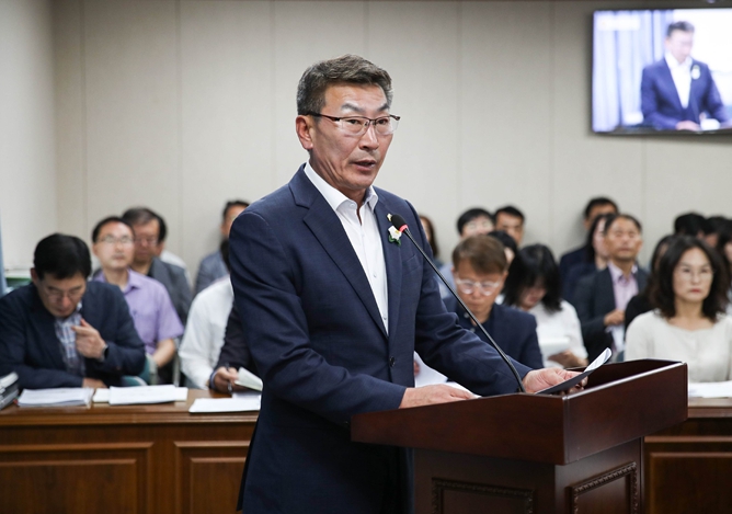 ![]() 김재철 도의원이 6월 4일, 전라남도의회 보건복지환경위원회 회의에서 ‘전라남도 환경산업 육성 및 지원 조례 일부개정조례안’에 대해 제안설명을 하고 있다.(전라남도의회 제공) |