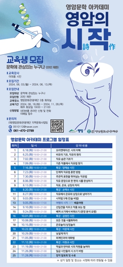 2024년 영암 문학 아카데미‘영암의 시작詩,作’의 과정은 6월 18일부터 11월 28일까지 매주 화요일 오후 7시부터 9시까지 2시간 총 25회차로 진행되며 ▲시 창작 기초과정 ▲전문가 특강 ▲배움여행 등 통해 참여자가 전문 문학인으로 성장할 수 있도록 다양한 프로그램이 운영될 예정이다.
