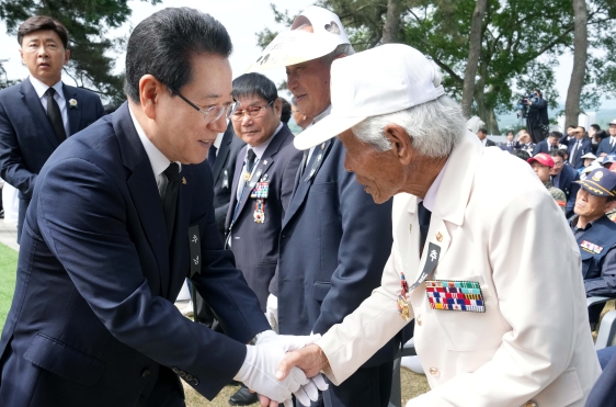 ![]() 김영록 전라남도지사가 6일 보성군 현충공원에서 열린 제69회 현충일 추념식에서 6·25 참전용사들과 인사를 나누고 있다. |