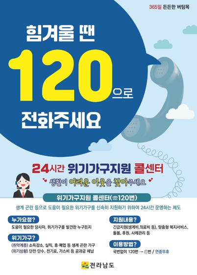 이호범 전남도 사회복지과장은 “생활이 어려운 당사자와 이를 발견한 주변 이웃, 누구든지 120번으로 전화를 걸어 도움을 요청하면 된다”며 “위기가구 발굴·지원에 최선을 다하겠다”고 말했다.