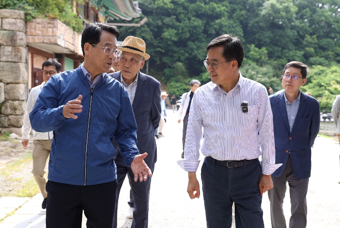 ![]() 강진군 도암면 만덕산 백련사에서 다산초당으로 넘어가는 길을 강진원 강진군수와 김동연 경기지사가 함께 걷고 있다. |