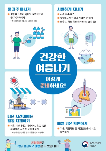 한편, 온열질환을 예방하기 위해 물 자주 마시기, 샤워 자주 하기, 외출 시 양산이나 모자 등으로 햇볕 차단하기, 낮 12시부터 5시까지는 야외 활동 자제하기, 기상 정보 확인하기 등 건강생활실천이 중요하다