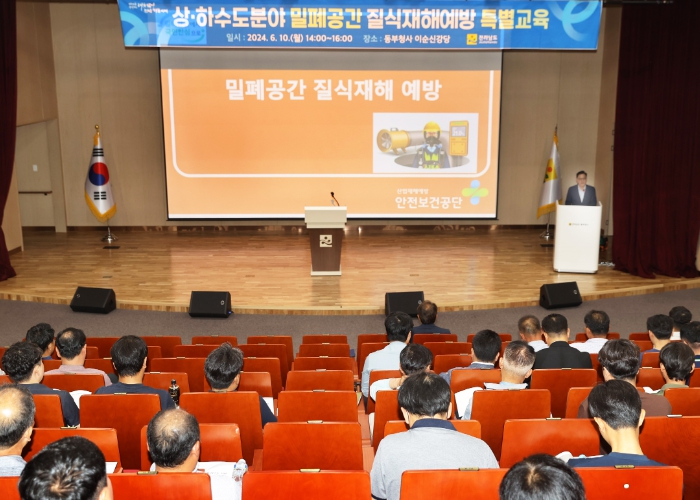 이번 교육은 상·하수도 관로, 맨홀, 정수장 및 하수처리장의 지하구조물, 기계실 등에서 발생할 수 있는 밀폐공간 내 산소 결핍이나 유해가스에 따른 질식, 화재·폭발 등 위험 등 사례를 중심으로 산업안전보건공단과 합동으로 진행됐다.