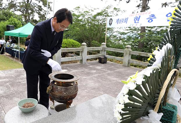 이날 행사는 오전 10시 정각, 전국에 울리는 사이렌 취명에 맞춰 1분간 순국선열과 호국영령에 대한 묵념을 시작으로 헌화 및 분향, 모범 보훈대상자 표창, 추념사, 헌시 낭송, 현충일의 노래 제창 순으로 진행됐다.