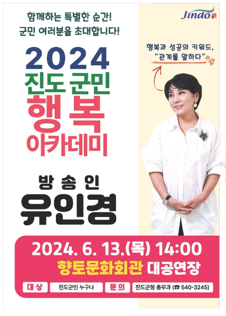 진도군 총무과 관계자는 “바쁜 일상 속에서 이번 강연을 통해 군민들이 행복에너지를 주고받는 뜻깊은 시간이 되길 바란다”고 말했다.