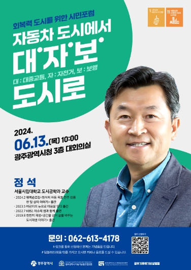 광주광역시는 오는 13일 오전 10시 시청 대회의실에서 도시재생·도시설계 석학 정석 교수(서울시립대 도시공학과)를 초빙해 ‘회복력 도시를 위한 시민포럼 자동차 도시에서 대·자·보(대중교통·자전거·보행) 도시로’를 주제로 특별강연을 개최한다.