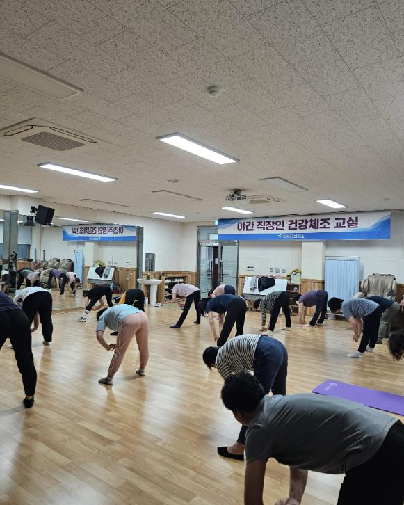 야간 직장인 체조교실은 직장인의 시간에 맞춰 퇴근후인 저녁 시간을 활용해, 전문 체조 강사가 남녀노소 누구나 쉽게 따라 할 수 있는 스트레칭, 건강체조, 라인댄스, 요가 등 신나고 즐거운 운동 동작으로 구성하여 진행해 왔다.