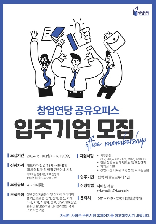 ![]() 순천시 창업연당, 24년 하반기 입주기업 모집 |