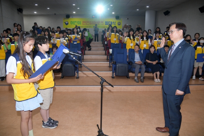 ![]() 고광완 광주광역시행정부시장이 12일 오전 시청 무등홀에서 열린 ‘어린이 안전히어로즈 발대식’에 참석해 위촉장을 수여한 후 어린이 대표로부터 안전실천 선서를 받고 있다./광주광역시 제공 |