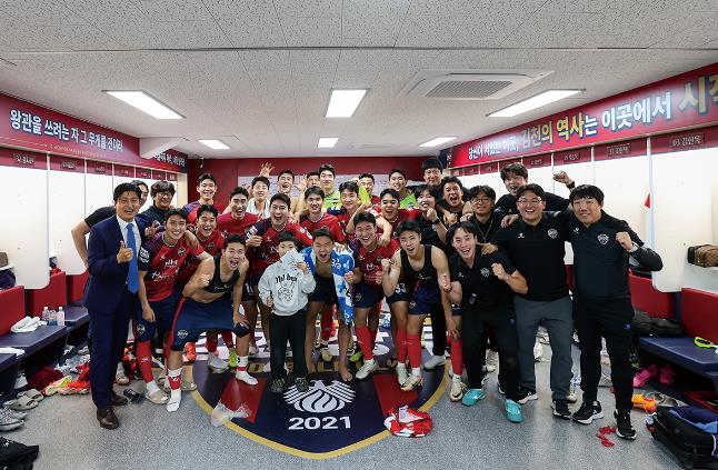 ![]() 지난 1일 포항전 승리 후 김천상무 선수단이 라커룸에서 '승리샷'을 찍고 있다 |