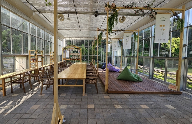 양묘(養苗)체험 공간으로 운영 예정이었던 38평 규모의 유리온실에는 포토월, 전시부스, 테이블과 의자, 에어컨 설치 등 실내 인테리어와 휴게 환경을 개선하고, 빈백 소파와 스툴 설치를 통해 이용객들이 오감으로 느끼고 휴식을 취할 수 있는 곳으로 만든다.
