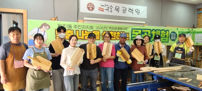 목공체험 프로그램에는 많은 주민들이 참여하여 이유식 도마, 초인종 지킴이 문패, 냄비 받침 등을 만들었다.