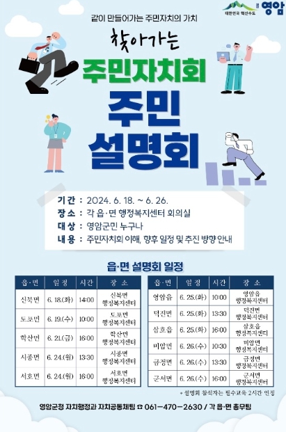 주민자치회 읍·면 설명회는 19일 도포면, 21일 학산면, 24일 시종·서호면, 25일 영암·삼호읍·덕진면, 26일 미암·금정·군서면으로 이어진다.
