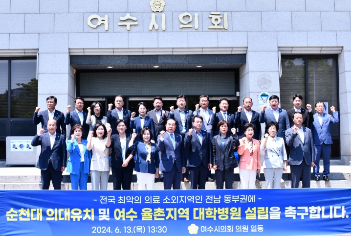 이에 여수시의회는 △ 순천대에 국립 의과대학을 설치할 것 △ 정부는 2005년 정부의 국·공립대학교 통·폐합 정책 추진에 따라 국립 여수대학교와 전남대학교간 통·폐합 협약서 및 양해각서를 성실히 이행할 것 △ 순천시는 순천대 국립 의과대학 설치에 따른 인접한 여수시 율촌면 지역에 대학병원 설립을 동의할 것을 촉구했다.