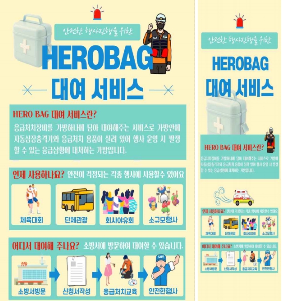 최진석 소방서장은 “요즘 구급차가 배치되지 않는 소규모 행사가 많은 만큼 응급처치에 필요한 물품으로 구성된 ‘HERO BAG 대여 서비스’를 많이 이용해 주시길 바란다”라고 말했다.