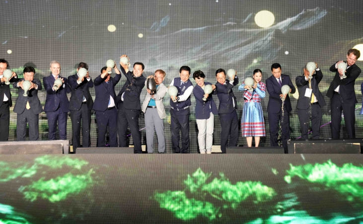 ![]() 김영록 전라남도지사가 17일 오후 서울 광화문광장에서 열린 ‘2024-2026 전남 세계관광문화대전 선포식’ 개막행사에서 참석자들과 전남관광 세계화를 상징하는 씨앗이 거대한 나무로 자라나며, 글로벌 관광 중심지로 거듭나게 될 전남의 미래를 상징적으로 표현하는 퍼포먼스를 펼치고 있다. |