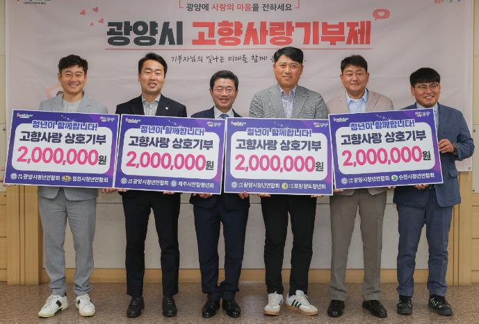 이번 기부는 고향사랑기부제 참여를 위해 광양시청년연합회가 직접 자매결연 단체에 제안해 성사된 것으로, 각 연합회와 20명씩 200만 원을 상호기부해 총 800만 원의 기부금을 광양시에 전달했다.