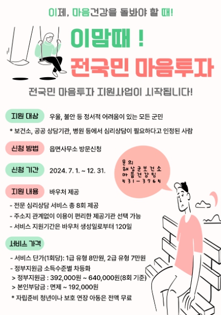 군 관계자는“7월부터 시작되는 전국민 마음투자 지원사업이 안정적으로 추진될 수 있도록 최선을 다하겠다”면서“군민의 정신 건강 돌봄 지원을 통해 마음도 건강하고 행복한 해남을 만들어 나가겠다.”고 전했다.