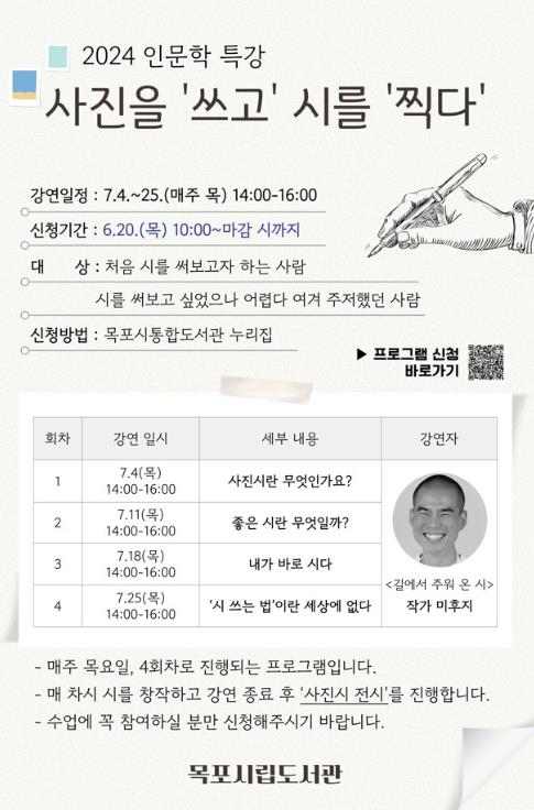 ![]() 목포시 2024 목포시립도서관 인문학강연 ‘사진을 쓰고 시를 찍다’ 진행 |