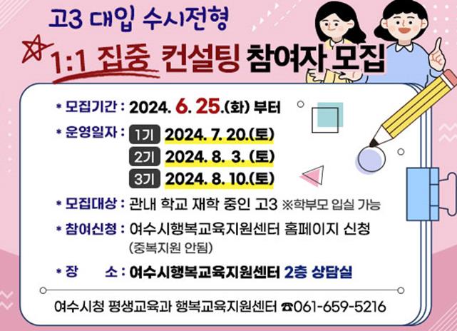 ![]() 여수시, 고3 위한 ‘대입 수시전형 1:1 집중 컨설팅’ 운영 |