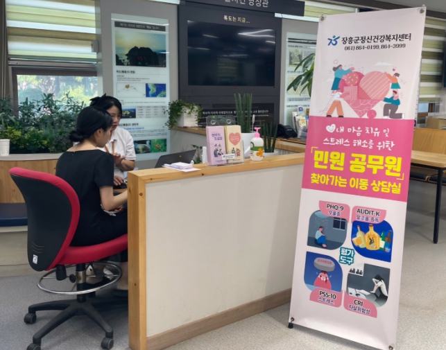 장흥군청 민원실에서 진행된 이동상담은 우울증 선별검사(PHQ-9), 스트레스 진단, 정신건강검사 등이 이뤄졌다.