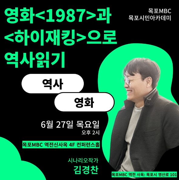 이번 아카데미 강좌는 시나리오 작가인 김경찬 작가를 초빙해 “영화 '1987'과 '하이재킹'으로 역사읽기”라는 주제로 진행된다.