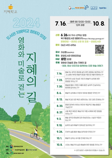 또한 지혜학교 과정은 인문 주제에 대해 깊이 있게 고찰해보는 대학 교양 수준의 심화 과정으로 ▲운암도서관 ‘영화와 미술로 걷는 지혜의 길’ ▲양산도서관 ‘고전으로 나와 우리를 돌아보는 삶의 지혜’ ▲신용도서관 ‘고통과 슬픔을 예술로 승화하는 삶의 지혜’ 프로그램이 공모에 선정됐다.