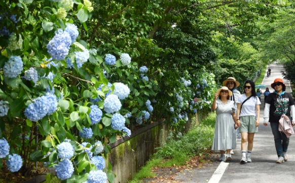![]() 수국길 축제장을 미리 찾은 관광객들이 수국을 바라보며 산책하고 있다 |