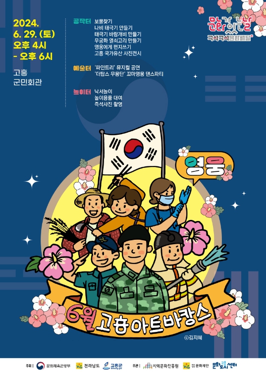 지난 6월 1일 ‘봄소풍’을 컨셉으로 군민들의 눈과 귀를 즐겁게 했다면 이번 6월 29일 고흥군민회관에서 펼쳐질 두 번째 고흥아트바캉스는 ‘영웅’을 주제로 나라 사랑을 실천하기 위한 다양한 프로그램을 운영해 감동을 주고 군민들의 가슴을 뜨겁게 할 전망이다.