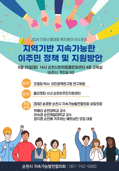 발제에는 조영희 이민정책연구원 연구위원의 ‘지속가능발전 관점에서 본 지자체 이민정책 활용방안’과 순천이주민지원센터 마리 율리엣따 수녀가 ‘우리 지역 이주민 이웃들’에 대해 발표한다.