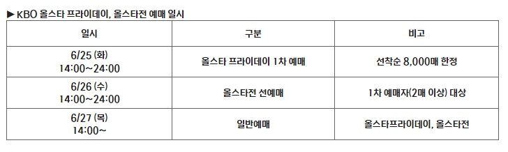 먼저 25일(화) 오후 2시부터 당일 자정까지는 7월 5일(금) 열리는 올스타 프라이데이 입장권에 대한 선예매(8,000매)가 실시된다. 올스타 프라이데이는 퓨처스 올스타전을 비롯해 KBO 리그 올스타 선수들이 펼치는 홈런레이스, 워터페스티벌 등 다채로운 프로그램으로 구성되어 있다.