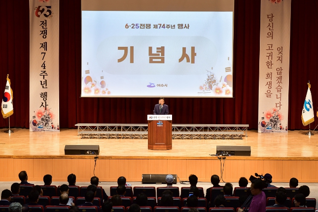 ![]() 정기명 여수시장이 25일 오전 여수문화홀에서 열린 6․25전쟁 제74주년 행사에서 기념사를 하고 있다. |