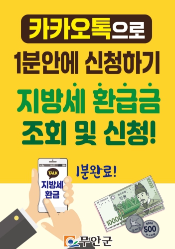 무안군은 그동안 전화, 위택스, 정부24 등을 통해서 지방세 환급 신청을 받아 왔으나 업무 시간 외에도 언제 어디서나 간편하게 신청할 수 있도록 카카오톡 채널을 2023년도부터 운영하여 납세자 중심의 적극행정 실천에 나서고 있다.
