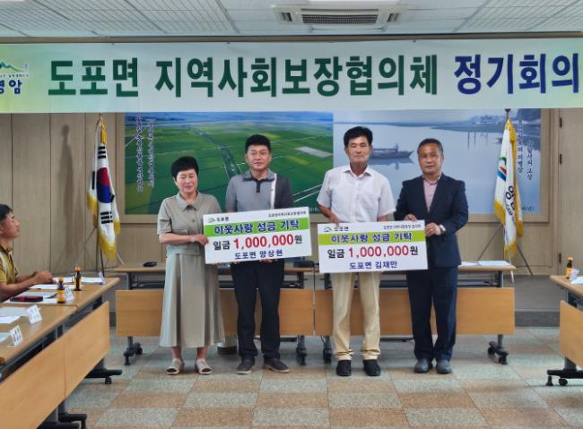 ![]() 김재만 이장단장과 양상현 새마을회장, 영암 도포면지사협에 이웃돕기 성금 기부 |