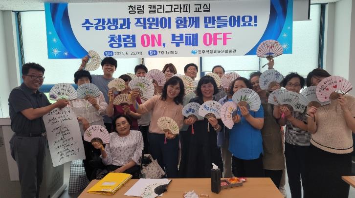 학생교육문화회관에 따르면 이번 청렴 교실은 `2023 광주광역시 교육청 청렴 슬로건`을 활용해 직원들과 수강생들이 화선지에 슬로건을 적어보고 부채를 만들어 보는 등 참여형 프로그램으로 진행됐다.