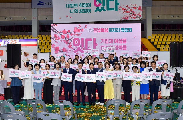 ![]() 지난 26일 여수 흥국체육관에서 열린 ‘전남 여성 일자리 박람회’ 개회식에서 정기명 여수시장을 비롯한 내빈들이 여성들의 취업 응원 퍼포먼스를 펼치고 있다. |