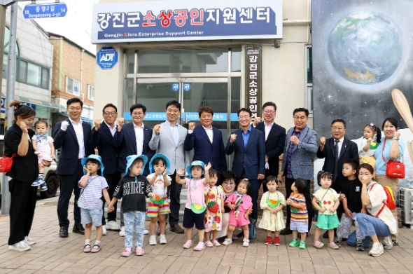 ![]() 강진군 소상공인지원센터 개소식에 체험학습을 온 어린이들과 기념촬영을 하고 있다. |