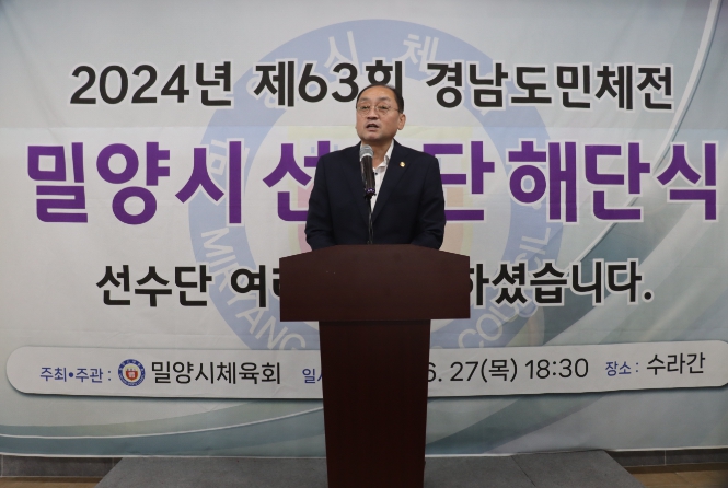 ![]() 지난 27일 제63회 경상남도민체육대회 밀양시 선수단 해단식에서 민경갑 체육회장이 인사말을 하고 있다. |