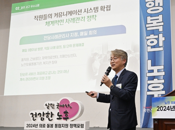 ![]() 김이강 서구청장이 지난 4월 세종시에서 열린 보건복지부 주관 정책포럼에서 ‘서구형 통합돌봄’에 대해 설명하고 있다. |