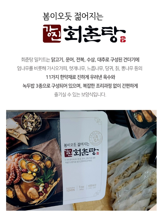 건강과 맛을 동시에 만족시키는 강진 회춘탕 밀키트는 1인용으로 1만5,000원에 구매할 수 있으며, 진하게 우려낸 육수와 건더기(닭고기, 문어, 전복, 수삼, 대추), 녹두죽으로 구성돼 있다.